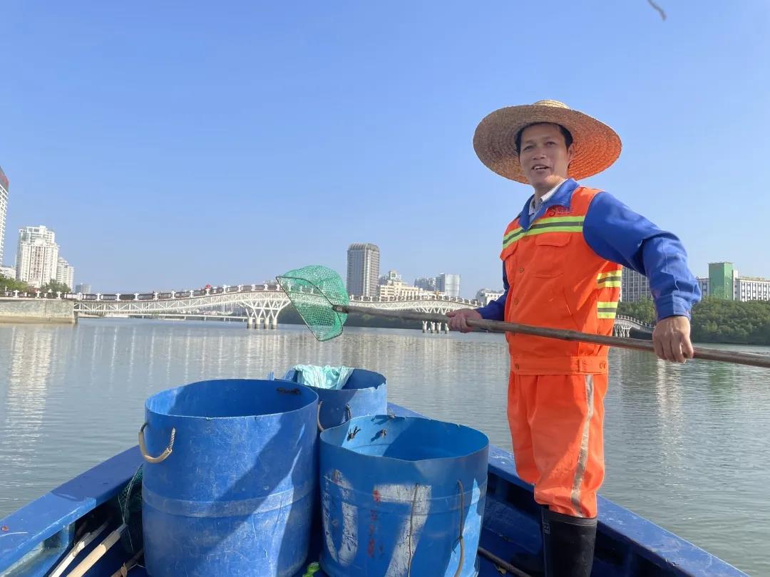 曾靈是三亞明佳園林環衛集團天涯區環衛二隊的一名員工,和我們平常在街邊看到清理地面垃圾的環衛工人有所不同,他的工作是在船上完成的,每天需要站在作業船上,手持一把長柄濾網,將漂浮在三亞河上的落葉、紙屑等垃圾打撈起來,放入專門的垃圾桶里再運輸走。記者來到曾靈的工作地點:三亞河,近距離了解他春節期間的工作是什么樣的……