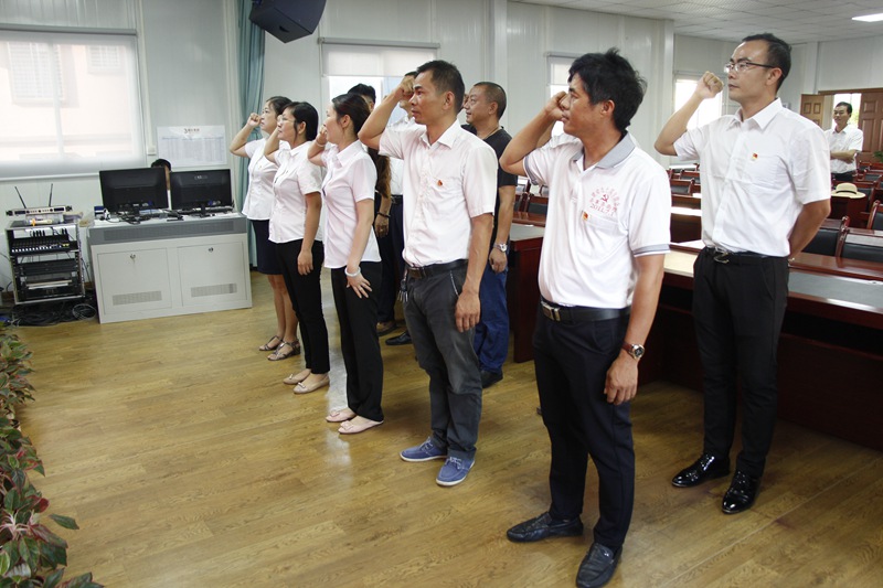 面對黨旗,高舉右手,莊嚴宣誓:“我志愿加入中國共產黨,擁護黨的綱領,遵守黨的章程,履行黨員義務,執行黨的決定,嚴守黨的紀律,保守黨的秘密,對黨忠誠,積極工作,為共產主義奮斗終身,隨時準備為黨和人民犧牲一切,永不叛黨!辩H鏘有力的宣誓聲,響徹大廳。
